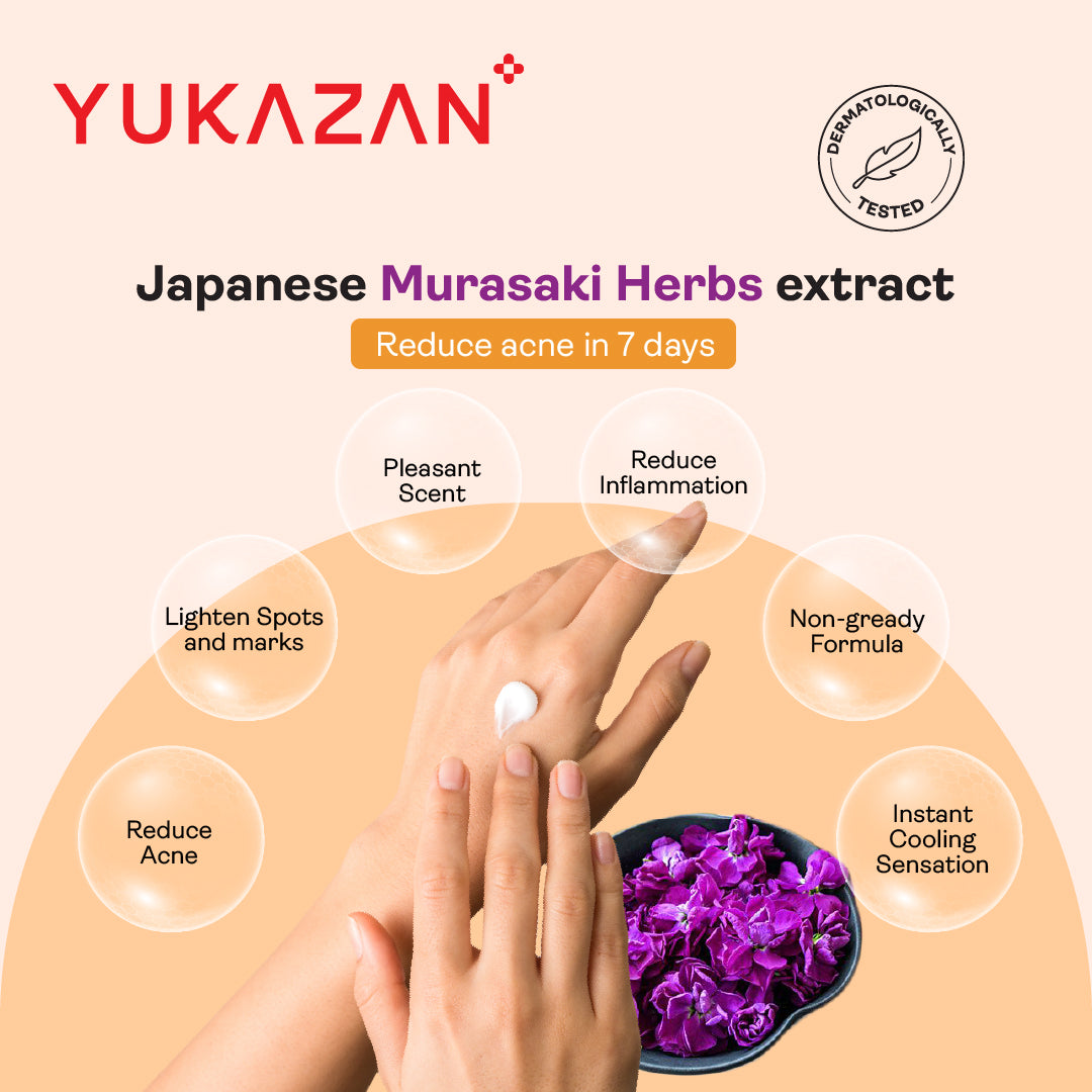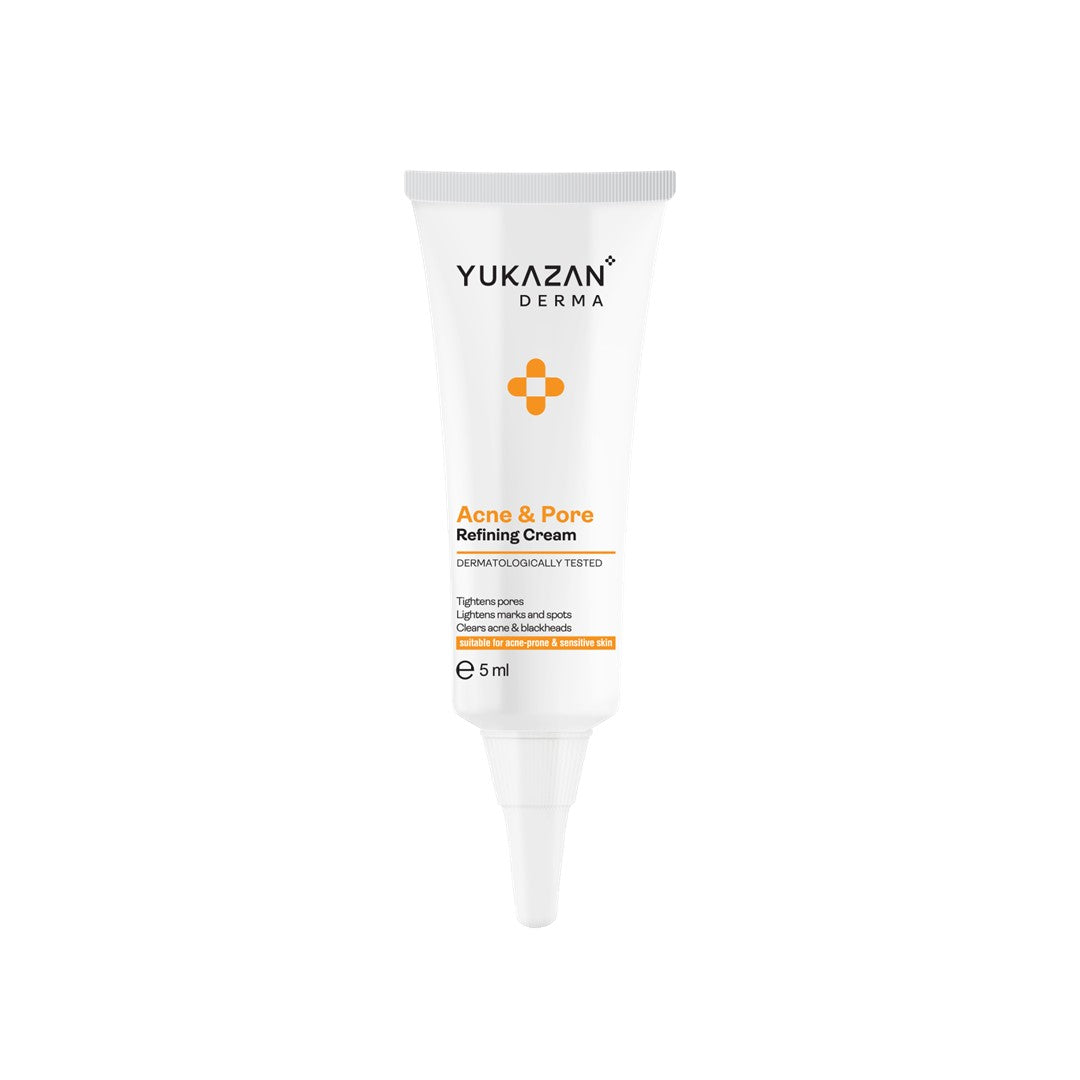 Yukazan Derma Refining Cream Acne & Pore 5ml It contain unique gentle herbal formula “Japan Murasaki” which effective in cleaning acne, excessive sebum and skin impurities. Leaving skin with pleasantly fresh, reduce redness and irritation.  Dermatologically tested Suitable for acne-prone types Tightens pores Lightens marks and spots Clears acne & blackheads   Ingredients: Aqua, Synthetic Beeswax, Butylene Glycol, Glyceryl Stearate, Cetearyl Alcohol, Dimethicone, PEG-100 Stearate, Salicylic Acid, Inulin, Menthol, Aminomethyl Propanol, Methylpropanediol, Phenoxyethanol, Ceteareth-20, Alcohol, Glycerin, Alpha-glucan Oligosaccharide, 4-terpineol, Allantoin, Xanthan Gum, Triethylene Glycol, Disodium EDTA, Lithospermum Erythrorhizon Root Extract, Salix Alba (Willow) Bark Extract, Caprylic/capric Triglyceride, Curcuma Longa (Turmeric) Root Extract, Docosahexaenoic Acid, Eicosapentaenoic Acid, Ethylhexylglycerin, Phosphatidylcholine, Phytosphingosine, Pinus Pinaster Bark Extract, Propanediol, Sorbitol, Tetrasodium Glutamate Diacetate, Tocopheryl Acetate.   Direction of Use: After cleansing and toning. Apply refining cream and massage until fully absorb. Add small amount of toner onto face to ease the absorption and for double hydration, concentrate on the T-zone or acne areas.   Warning: For external use only, avoid contact with eyes, rinse thoroughly with water if occurs. Keep out of reach from children.   Storage: Keep in a cool and dry place.
