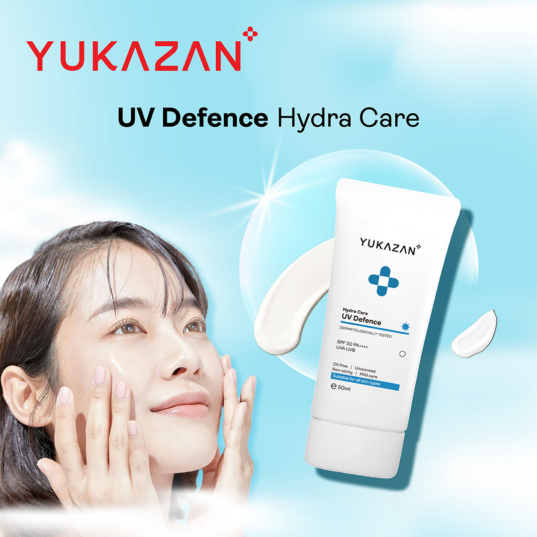Yukazan Hydra Care UV Defence 50ml  A mild and oil-free sunscreen with gentle formulation providing protection against harmful uv rays. - Won't cause breakout - No white residue - Matte flawless finish - Hydrates skin Ingredients: Water, Titanium Dioxide, Isohexadecane, Neopentyl Glycol Diheptanoate, Glycerin, Sodium Chloride, Cetyl Ethylhexanoate, Butylene Glycol, C12-15 Alkyl Benzoate, Phenoxyethanol, Zinc Oxide,O-cymen-5-ol, Polyglyceryl-2 Dipolyhydroxystearate, Phenyl Trimethicone, Bifida Ferment Lysate, Lauryl Peg-10 Tris (Trimethylsiloxy)silylethyl Dimethicone, Disteardimonium Hectorite, Sorbitan Sesquioleate, Silica, Boron Nitride, Ethylhexyl Hydroxystearate, 1,2-hexanediol, Triethoxycaprylylsilane, Aloe Barbadensis Leaf Water, Nelumbo Nucifera Flower Water, Inositol, Betaine, Trehalose, Niacinamide, Rosa Damascena Flower Water, Citric Acid, Hydroxyacetophenone, Tocopheryl Acetate, Tocopherol, Pentylene Glycol, Alumina, Ethylhexyl Methoxycinnamate, Salix Alba (Willow) Bark Extract, Anogeissus Leiocarpa Bark Extract, Sodium Hyaluronate, Agaricus Bisporus(Mushroom)Extract Isopentyldiol,Bis-ethylhexyloxyphenol Methoxyphenyl Triazine, Ethylhexy|glycerin, Calamine, CI 77891, CI 77163 " Dispense two finger length (thin lines). Apply evenly as last step of skincare routine or before make up. For external use only, avoid contact with eyes, rinse thoroughly with water if occurs.